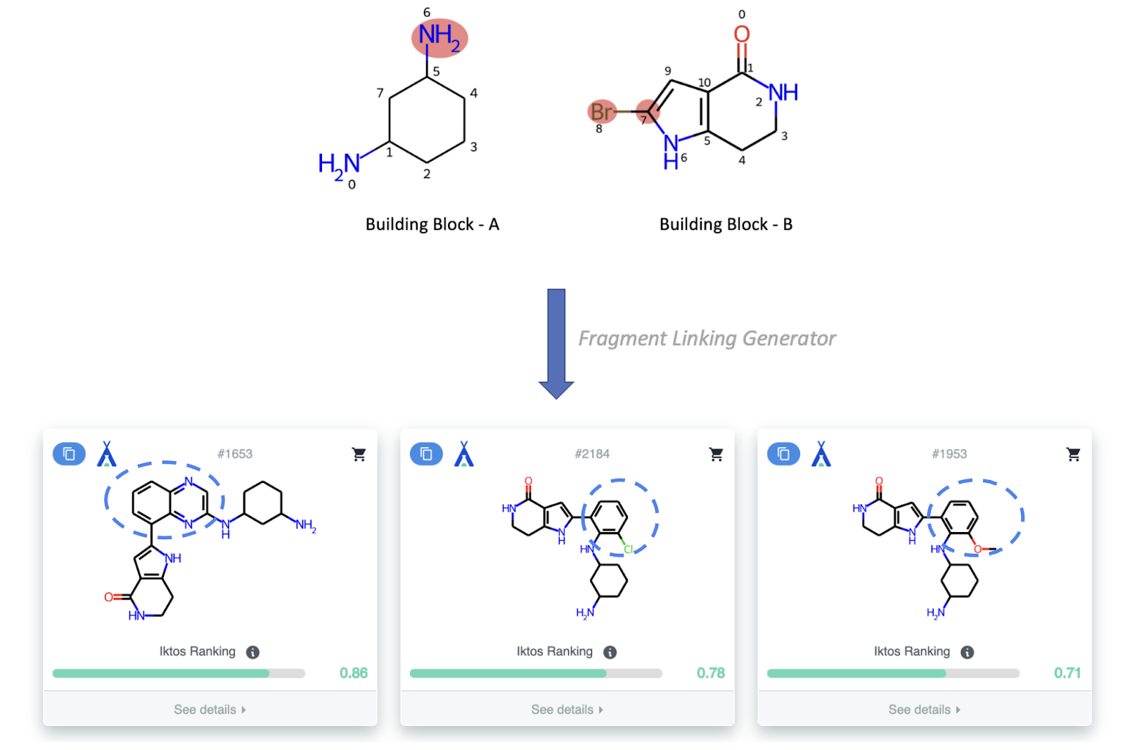 For example, given a couple of building blocks: A and B and their reaction centers (exit vectors) -NH2 and -Br respectively, the fragment linking generator will propose novel compounds by attaching new scaffolds at those centers while keeping the rest of the building blocks intact.